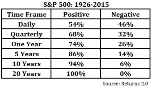 Historicky je podle něj přibližně 90% pravděpodobnost (v tabulce z roku 2016 je dokonce 94%), že v desetiletém horizontu akcie zdraží. Ve 20letém horizontu zatím akcie (ty americké, nutno podotknout) nikdy v historii neklesly. "Je zřejmé, že propady cen akcií jsou při takto dlouhém horizontu ideální příležitostí k dokupování pozic," dodává Brown.