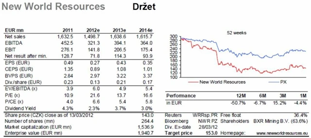 Po dobré výkonnosti akcie v posledním čtvrtletí a výhledu prodejního mixu, který zklamal, snižujeme doporučení na akcie NWR z "akumulovat" na "držet". Roční cílovou cenu (odvozenou z DCF modelu) zvyšujeme o 9 % na 153 Kč na akcii z důvodu zvýšených odhadů dlouhodobých cen koksovatelného uhlí a nižší bezrizikové úrokové míry. Krátkodobé odhady zisku EBITDA pro letošní rok jsme naopak kvůli špatnému výhledu produkčního mixu i cen snížili o 29 %.