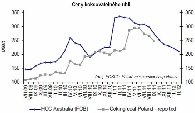 Společnost ovšem snížila očekávaný podíl koksovatelného uhlí ve své prodejním mixu pro rok 2012 ze zhruba 60 % na 48 % (v roce 2011 to bylo 46 %) a v následujících dvou až třech letech očekává tento podíl jen mírně nad 50 %.
