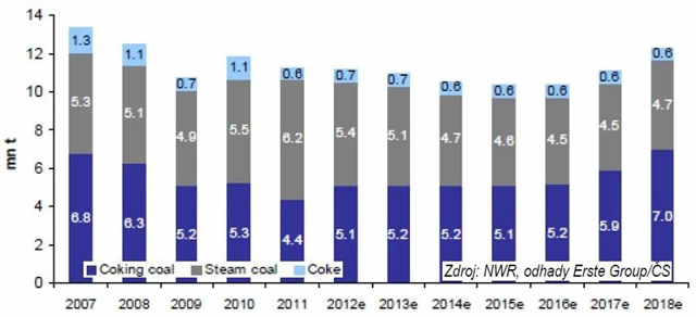 U NWR také očekáváme postupně klesající celkovou produkci až do rozjezdu dolu Debiensko v roce 2017, který by měl produkci ve srovnání s rokem 2010 zvednout o zhruba 7 % (odhad ČS) a podíl koksovateného uhlí zvednout nad 60 % (očekáváme 63 %).