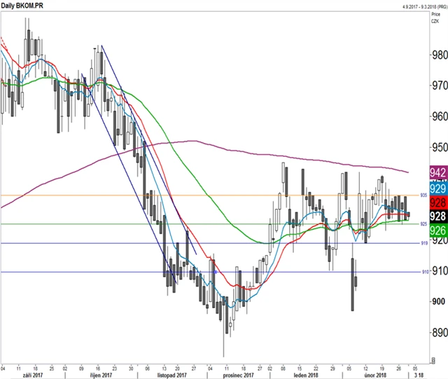 Akcie Komerční banky se v poslední době pohybují do strany. Poklesu zatím brání 50denní průměr, ostatní krátkodobé průměry kurz protíná bez větších problémů. Při proražení 50denního průměru a supportu na 925 by mohlo dojít k silnějšímu propadu. Nejbližší rezistence je na 935, následuje 200denní průměr. Nejbližším supportem je 50denní průměr, následují úrovně 925 a 919. Indikátory nevysílají žádný výraznější signál.