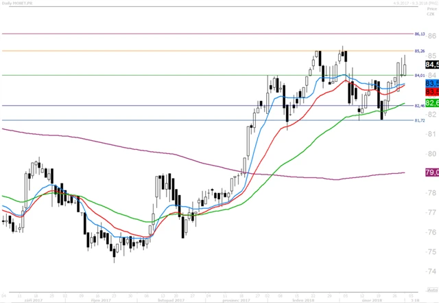 Cena akcií Monety Money Bank v posledních dnech roste a dostala se nad krátkodobé průměry. Po středečním uzavření na supportem se ve čtvrtek dopoledne vydala výše a přibližovala se rezistenci na 85,26. RSI je poblíž neutrální hladiny. Aktuálně se zdá, že má titul nakročeno k dalšímu pozitivnímu vývoji, rozhodující bude rezistence na 85,26. Propadu může zabránit support na 84, případně krátkodobé průměry.