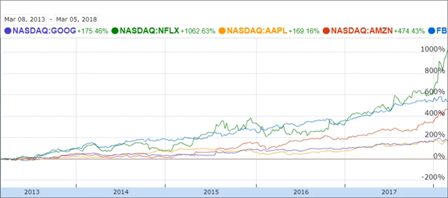 Vývoj cen akcií FAANG, zdroj: Google Finance
