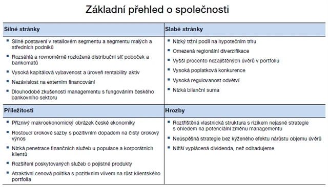 Současný příznivý ekonomický vývoj v České republice se projevuje na zvýšené úvěrové aktivitě. Bankovní prostředí je ovšem nadále sužováno nízkými úrokovými sazbami a tvrdou konkurencí. Postupné zpřísňování měnové politiky ČNB, které začalo loni, by mělo mít pozitivní dopad na úrokové marže.