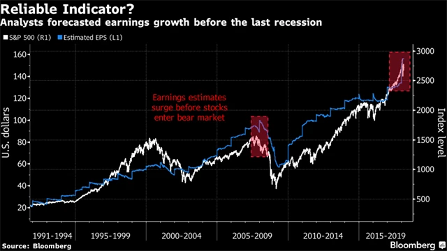 Před devíti lety, kdy byly americké akcie na dně, byly předpovědi analytiků ohledně zisků firem velice pesimistické. Nakonec ale zisky rostly a s nimi začaly růst i ceny akcií. V roce 2007 zase měly předpovědi analytiků ohledně zisků akcií v indexu S&P 500 na další rok "severní" směr, nakonec byly mimo o 41 procentních bodů.