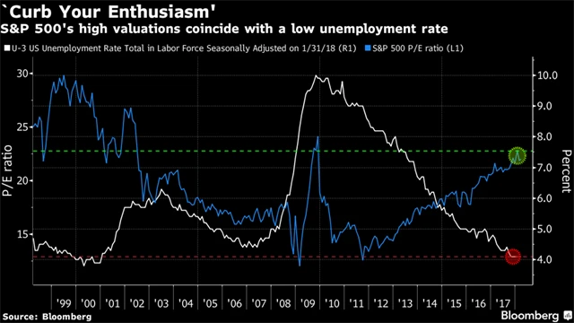 Vysoké P/E a nízká nezměstnanost vs. S&P 500