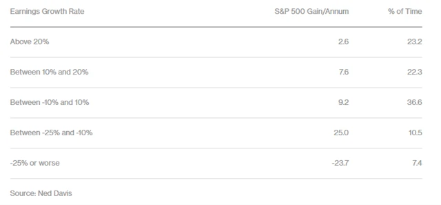 Dalším nebezpečím může být tempo, jakým rostou zisky společností. Na první pohled to sice může vypadat jako terno, ale nemusí to být dobrá zpráva. Podle společnosti Ned Davis Research, která shromáždila data od roku 1927, mají rostoucí zisky firem inverzní vztah s výnosy akciových trhů. To znamená, že čím rychlejší je růst zisků firem, tím pomalejší je růst akciového trhu.