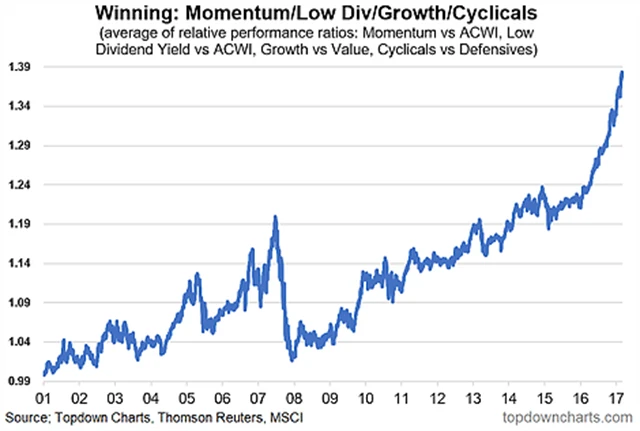Následující graf je vyjádřením průměrné relativní výkonnosti světových cyklických akcií, cenných papírů se silným růstovým momentem, akcií s nízkými dividendovými výnosy a cenných papírů růstově orientovaných podniků. Potvrzuje se tedy, že (stejně jako v USA) i ve zbytku světa růst srovnávacích indexů výrazně urychlují akcie vybraných společností, v důsledku čehož dochází ke zkreslování celkové situace na trzích.