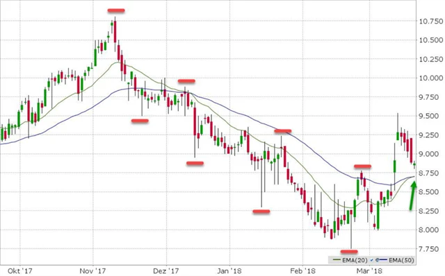 Pro vstup do pozice je dobré počkat na odraz od klouzavých průměrů. Ty by měly aktuálně sloužit jako supporty, ale pokud nezafungují a cena sklouzne níže, od vstupu upouštíme. Se ziskem míříme na 10,25 EUR a stop-loss pokládáme na 8,45 EUR.