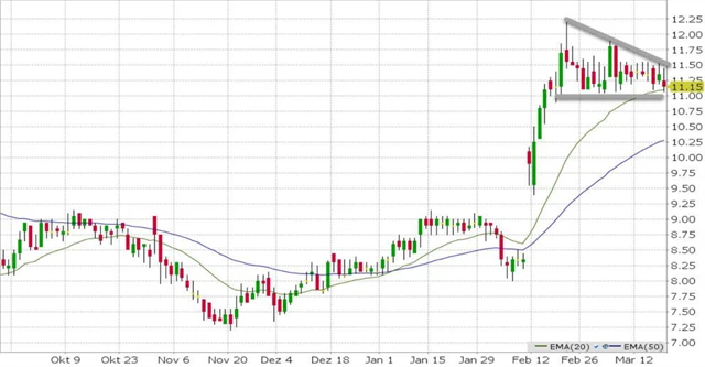 Spodní hrana trojúhelníku tvoří silnou podporu, ale v případě jejího prolomení od vstupu upouštíme. Do pozice budeme vstupovat po proražení horní hrany na 11,60 USD, výstup plánujeme na 13,50 USD.