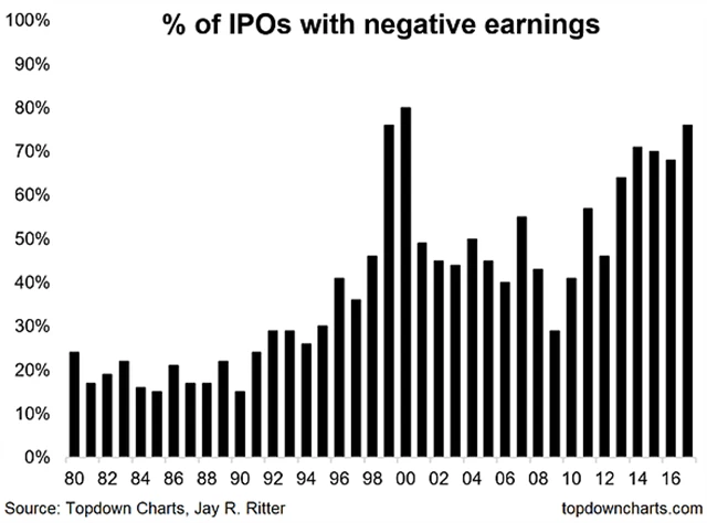 Graf ukazuje podíl firem, které jsou ve ztrátě, na celkovém počtu společností, jež své akcie nabídly na burze. 76 % firem, které loni uskutečnily IPO, bylo ztrátových. Jde o nejvyšší podíl od roku 2000, kdy byl rekordní, a stejný jako v roce 1999.