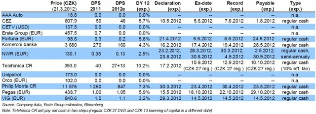 Českou dividendovou sezónu zahájila v únoru Komerční banka, která plánuje vyplatit akcionářům 160 korun na akcii. Telefónica bude vyplácet znovu 40 korun na akcii, z čehož 13 korun bude vyplaceno z kapitálu (nepodléhá zdanění). Zároveň plánuje zpětné odkupy akcií. Rozhodné dny pro dividendu se blíží u NWR, Komerční banky a tradiční dividendové hvězdy Philip Morris ČR. Jaký je dividendový kalendář titulů z hlavního trhu SPAD pražské burzy? Oznámené termíny a odhady na základě loňských údajů v přehledné tabulce.