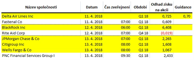 Které světové firmy představí výsledky hospodaření za uplynulý kvartál v týdnu od 9. dubna a jaké zisky v rámci indexu S&P 500 a od jednotlivých společností očekávají analytici oslovení agenturami Thomson Reuters a Bloomberg?