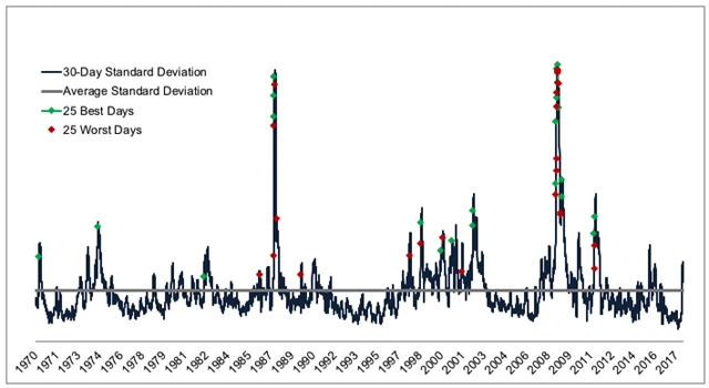 Nejlepší i nejhorší dny pro akcie v USA přocházejí v obdobích nadprůměrné volatility