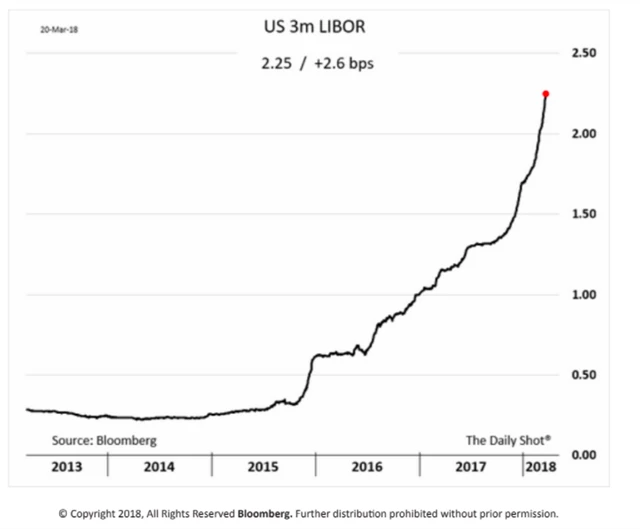 Tříměsíční dolarová sazba LIBOR pokračuje v rychlém růstu a za poslední půlrok vzrostla na dvojnásobek. Na současné úrovni 2,3 % je celkem vysoko nad výnosem tříměsíčních amerických dluhopisů (okolo 1,75 %). Je to dáno tím, že sazby státních dluhopisů má částečně "pod kontrolou" vláda, a také to ukazuje na to, že trh očekává rychlejší zvyšování sazeb ze strany Fedu. Centrální banka tedy vlastně zaostává za trhem. Drahé úvěry pak zdražují zpětné odkupy akcií, které v posledních letech táhly akciové trhy nahoru, a také půjčky na nákupy akcií. V neposlední řadě dělají vyšší sazby z akcií méně zajímavý investiční nástroj, protože firemní dluhopisy nabízejí atraktivnější úroky.