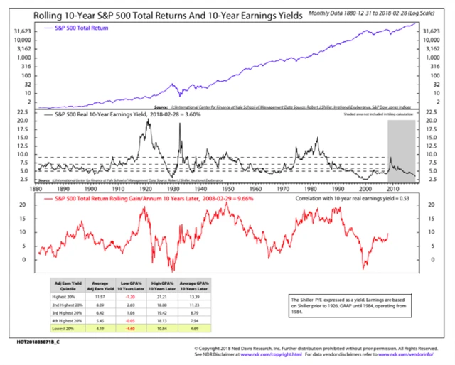 Další graf ukazuje, že výnosy akciového indexu indexu S&P 500 mohly být pro investory zajímavé v dobách, kdy byly úrokové sazby proklatě nízko. Ziskový výnos akciového trhu (takzvaný earnings yield se počítá jako obrácená hodnota tržního ukazatele P/E; ukazuje, jaký výnos by investor obdržel, pokud by byl celý zisk firmy vyplacen jako dividenda) se pohybuje kolem 3,6 %, dividendový výnos je na asi 1,8 % a celkový výnos je 5,4 %. Při sazbách kolem nuly to mohlo být atraktivní, ale s růstem úroků se stávají akcie relativně méně zajímavými.