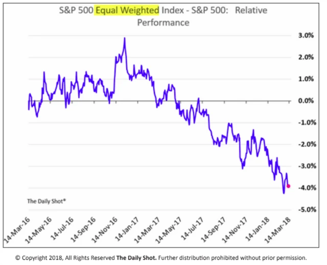 Výkonnost indexu S&P 500 není zrovna zdravá. Když odečteme výkonnost indexu, v němž každá akcie má stejnou váhu (equal weighted), dostaneme se na asi -4 % za poslední dva roky (standardní S&P 500 je stále v plusu přes 10 %). Na první pohled to vypadá hezky, ale větší část titulů z indexu ztrácí.