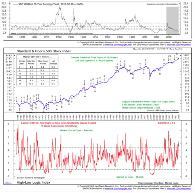 Předposlední graf patří do kategorie "budeme to kreslit, dokud to nebude vypadat hezky". Takzvaný High-Low Logic Index je založen na 52týdenních maximech a minimech a používá navíc 10týdenní exponenciální vyhlazování. Pozitivní výnosy lze statisticky očekávat, když je ukazatel na úrovni 1 nebo nižší. Momentálně je však na 3,7 a byl již na 4,5, což znamená jasný prodejní signál.