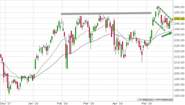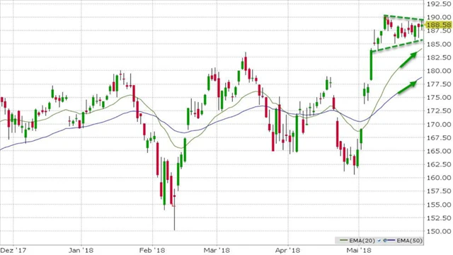 Předchozí maximum bylo volatilně prolomeno, což je pro nás signál síly. V květnu již akcie přidaly přes 15 %, takže titul nyní zaslouženě odpočívá. Na denním grafu se formuje býčí vlajka, která slibuje vyšší pravděpodobnost proražení ceny výše.