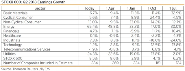 Jak se vyvíjejí odhady růstu či poklesu zisků evropských firem za 2Q2018?