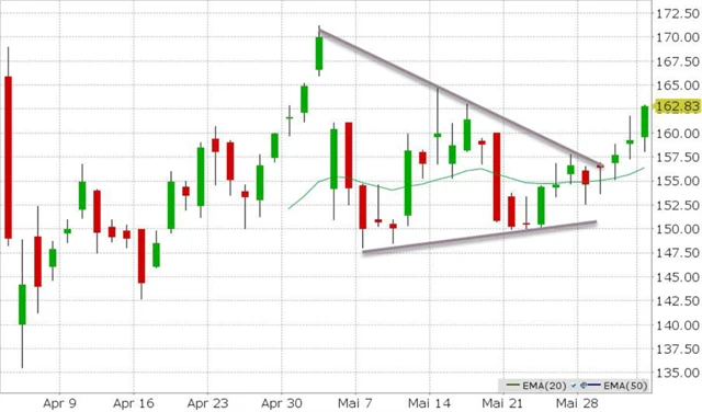 Nákupní pokyn nastavujeme na 159 USD. Těsně pod ním je rychlejší klouzavý průměr, který může posloužit jako podpora. Ziskový cíl nastavujeme na 175 USD a stop-loss pod poslední swing low na 151 USD.