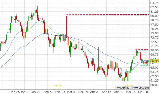 Vstupovat budeme na 67,30 USD. Nastavujeme nákupní stop pokyn, který bude spuštěn jen v případě, že cena tuto oblast prolomí. Pokud se naopak graf kurzu ohne dolů pod 65,40 USD, od vstupu upouštíme. Se ziskem míříme na 80 USD a stop-loss položíme na 65,40 USD.
