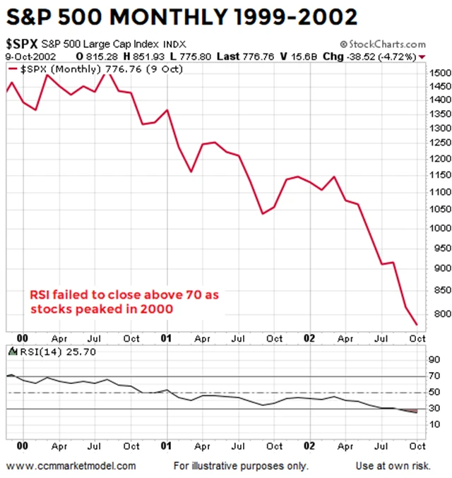 RSI na konci roku 1999 klesl pod 70, což vyslalo prodejní signál několik měsíců před maximem, ze kterého se spustil medvědí trend. Po celou dobu jeho trvání se již RSI nad 70 nedostal.