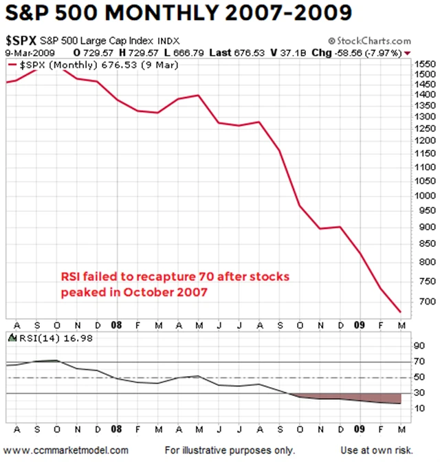 Podobně na tom byl index S&P 500 v roce 2007, tehdy akorát RSI klesl pod 70 ve stejné době, kdy akciový index dosáhl maxima, a ideálně tak ukázal na obrat trendu. Stejně jako o sedm let dříve se RSI v průběhu medvědího trendu nepřehoupl přes 70.