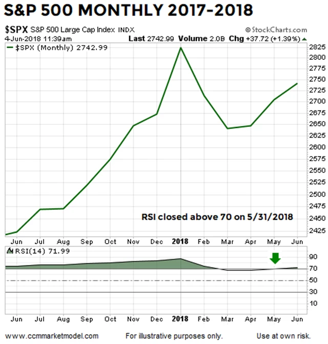 Letos v únoru se RSI po dosažení maxima indexu S&P 500 dostal pod 70, ale na konci května se nad tuto hranici překoupenosti vrátil. Může to znamenat, že se tentokrát žádný obrat trendu nekoná.