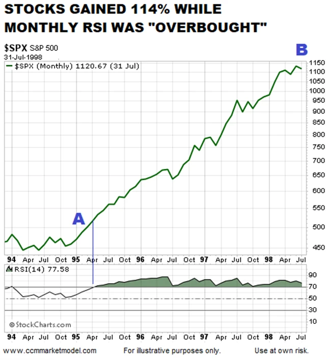Oscilátory, jako je RSI, mohou naznačit změnu trendu, na druhou stranu ale platí, že nic není dokonalé. Překoupené podmínky tedy nemusejí znamenat, že na trhu dojde k obratu. Příkladem je vývoj mezi roky 1994 a 1998, kdy byl RSI nad 70 již od dubna 1995, ale akcie nadále posilovaly a vyhouply se na více než dvojnásobek své hodnoty.