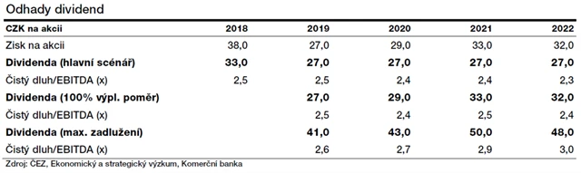 "Pozitivní výsledky obojího se mohou odrazit i na vyšší dividendě, která by se mohla udržet nad 30 Kč na akcii. Náš hlavní scénář počítá s dividendou z letošního roku 27 Kč, což by odpovídalo 100% výplatnímu poměru. V dlouhodobém horizontu předpokládáme návrat k původní dividendové politice, tedy k výplatě 60-80 % očištěného čistého zisku," napsal Miroslav Frayer.