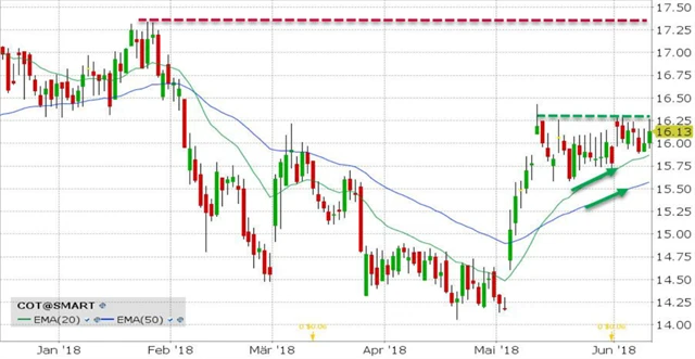 Nákupní stop pokyn nastavujeme na 16,35 USD, tedy těsně nad proražení vyznačené rezistence. Z technického pohledu jde o velice pěknou situaci, očekáváme rychlý nárůst ceny k posledním maximům na hladině 17,30 USD, kam klademe cíl. Stop-loss pokládáme pod poslední minimum na 15,79 USD.
