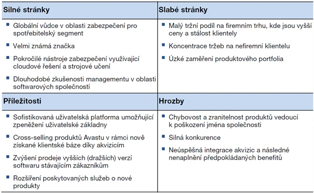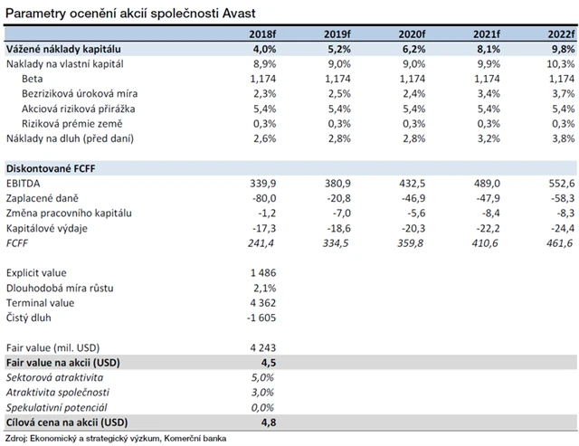 Samotný cílový trh Avastu poroste v příštích čtyřech letech průměrným tempem 10,1 % ročně. "Po úplné integraci akvizic počítáme s nákladovými synergiemi, které vylepší ziskovost společnosti," píše analytik Jiří Kostka z Komerční banky.