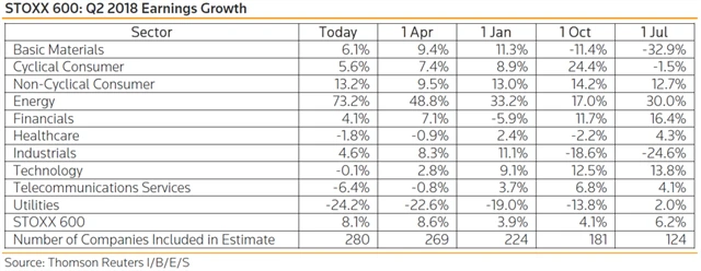 Jak se vyvíjejí odhady růstu či poklesu zisků evropských firem za 2Q2018?
