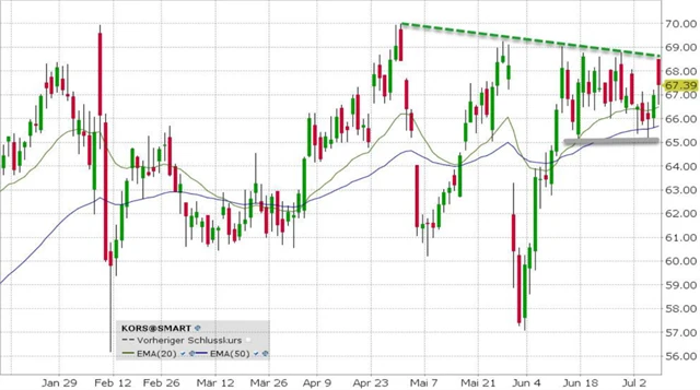 Agresivnější obchodníci mohou nákupy uskutečnit již nad 69 USD. Cena by se neměla opět svézt pod 65 USD. Čtvrtletní výsledky budou zveřejněny až koncem srpna, do té doby by neměla přijít žádná překvapení, pokud jde o fundament.