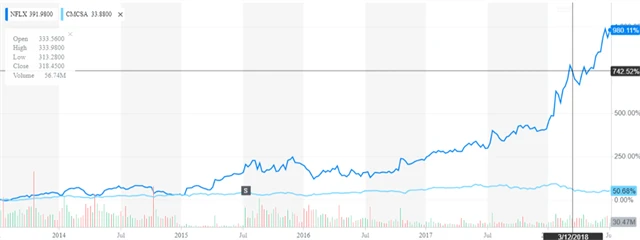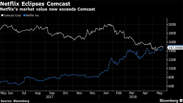 Dále je to složitější. Brown uvádí příklad srovnání vývoje cen akcií Netflixu a Comcastu. Comcast loni vydělal 22 miliard dolarů čistého z tržeb 85 miliard, zatímco Netflix měl čistý zisk 550 milionů z tržeb 11,7 miliardy dolarů. Tržní kapitalizace obou firem na konci května (kdy se k nim Brown vyjadřoval) se pohybovala těsně pod 150 miliardami dolarů.