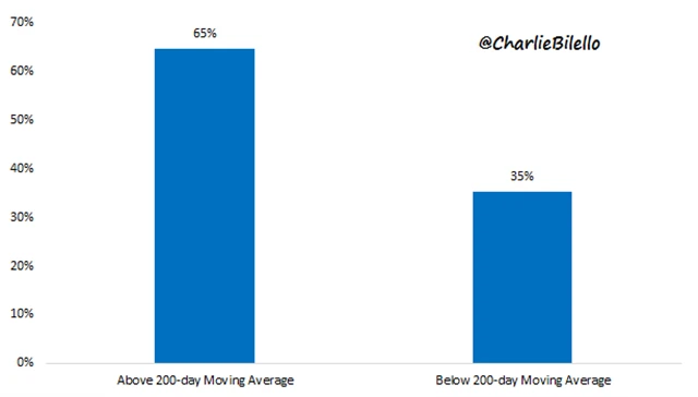 Lze tedy vysledovat, že když je Dow pod 200denním průměrem, nastává vyšší volatilita, nižší výnosy a větší pravděpodobnost mimořádně nepříznivých obchodních seancí. V uplynulých pěti letech investoři takových dnů mnoho nezažili, Dow byl nad zmíněným průměrem v 90 % obchodních dnů (historicky jen 65 %). A jen velcí akcioví optimisté aktuálně věří, že taková historicky nadprůměrná výkonnost americkým akciím vydrží.