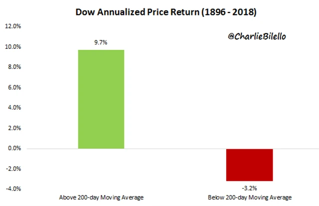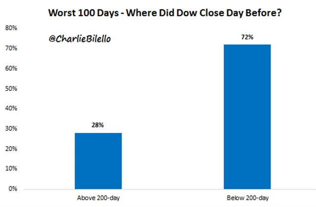 Před 100 nejhoršími obchodními dny historie (ztráty hlubší než 4,6 %) byl Dow pod 200denním průměrem v 72 % případů.