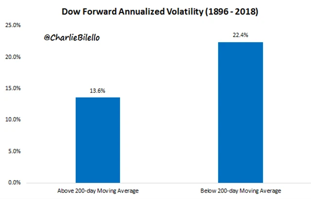 Roční volatilita Dow po uzavření pod dlouhodobým klouzavým průměrem je v průměru 22,4 %, při uzavírání nad 200MA pouze 13,6 %.