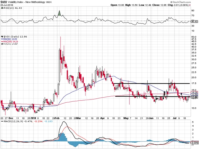 Index volatility VIX za týden sice mírně vzrostl, ale je stále na nízké úrovni pod dřívějším "klidovým" pásmem 13-17 bodů. Pro akcie tak vysílá pozitivní signál.
