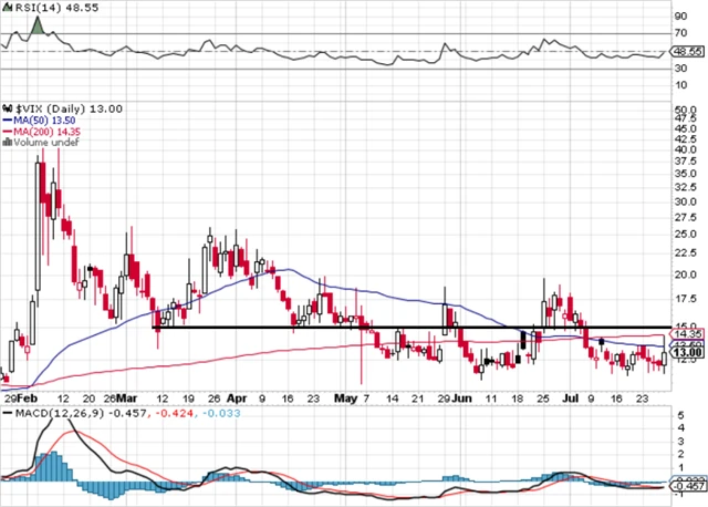 Index volatility VIX se v uplynulém měsíci dostal na velice nízké úrovně. Páteční pokles indexu S&P 500 posunul VIX na 13. Dokud zůstane pod 15, bude pro akcie býčím signálem.