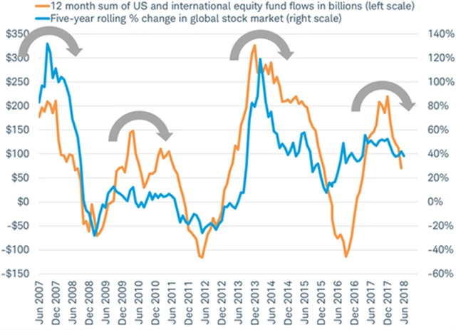 Investoři mají tendenci se chovat podle toho, jak se daří trhům, což je v posledních letech dobře vidět. V roce 2017 byl příliv peněz do akciových fondů (v době růstu na trzích) velice silný, ale po propadech na začátku letošního roku se trend obrátil.