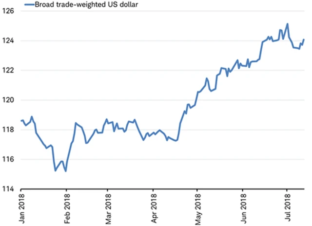 Výrazné (a trvalé) zvyšování hodnoty americké měny je dalším rizikem, s nímž musejí investoři počítat. Po výrazném poklesu v roce 2017 začal dolar letos v dubnu posilovat, což může negativně působit na dolarové výnosy. Rovněž to může vést k růstu napětí v globálním obchodu, kdy oslabování některých měn může znamenat konkurenční výhodu v souboji s americkými firmami.