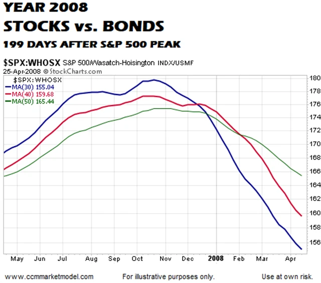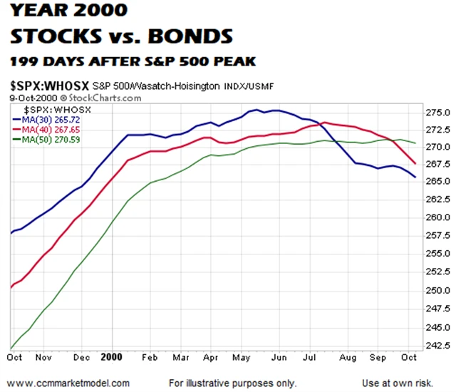Na prvním grafu je podíl akcií a dluhopisů v portfoliích investorů a tři klouzavé průměry, které zobrazují trendy v chování investorů. Index S&P 500 dosáhl vrcholu 24. března 2000 a 199 dnů poté, v polovině října, byl po poměrně volatilním průběhu ve ztrátě okolo 10 %. 30denní klouzavý průměr klesl výrazně pod 40- i 50denní průměr. Podle Ciovacca jde o známku toho, že investoři přestávali věřit akciím a dávali přednost dluhopisům.