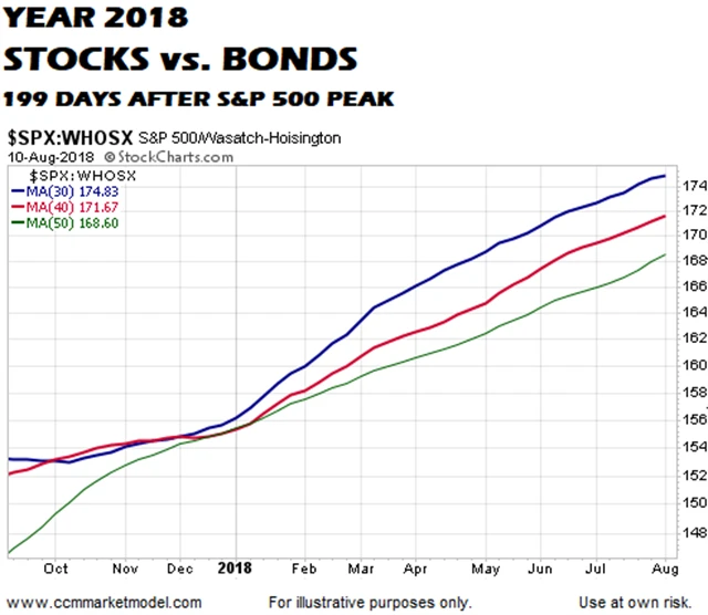 Chris Ciovacco, který se často zaměřuje na technickou stránku a studium grafů, porovnal chování investorů 199 dnů po vrcholu předchozích dvou býčích trendů s jejich chováním po letošním vrcholu na konci ledna. Chtěl zjistit, jak reagovali investoři na pokles několik měsíců po jeho začátku a zda ponechali peníze investované v akciích, nebo dali přednost dluhopisům.