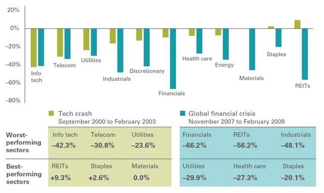 Na začátku milénia, po prasknutí technologické bubliny, na tom byly ze sektorů nejhůře IT, telekomunikace a veřejné služby. V době finanční krize pak nejvíce ztrácely nemovitosti, finanční sektor a průmysl. Právě nemovitosti však na tom byly na začátku tisíciletí nejlépe, veřejné služby ztrácely nejméně v době finanční krize.