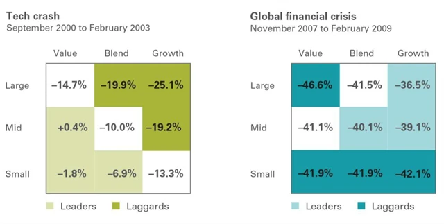 Další graf ukazuje, že soustředění se na velikost nebo investiční styl také nemusí během medvědího trendu vést k nadprůměrným výsledkům. Mezi lety 2000 a 2003 na tom byly nejhůře velké růstové firmy, přičemž středně velké a malé hodnotové společnosti skončily nejlépe. Finanční krize byla pohromou především pro malé firmy bez rozdílu, velké růstové firmy zaznamenaly nejnižší ztráty (obecně poslední medvědí trend zasáhl všechny segmenty podobně).