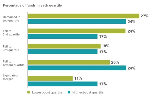 Na dalším grafu je vidět, že jen asi čtvrtina fondů, které měly při medvědím trendu nejlepší výkonnost, zůstalo mezi nejlepšími. A stejně tak asi čtvrtina (u těch nejlevnějších pětina) spadla mezi výkonnostně nejhorší (poslední řádek zobrazuje, kolik jich zaniklo nebo bylo sloučeno s jinými fondy).