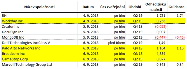 Které světové firmy představí výsledky hospodaření za uplynulý kvartál v týdnu od 3. září a jaké zisky v rámci indexu S&P 500 a od jednotlivých společností očekávají analytici oslovení agenturami Thomson Reuters a Bloomberg?