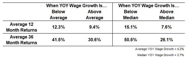 Ben Carlson ze společnosti Ritholtz Wealth Management se zaměřil na vliv mezd na akciové trhy a zjistil jak průměrnou, tak mediánovou meziroční procentuální změnu. Od roku 1962 to bylo 4,2 % a 3,7 % (medián proto, že průměrná hodnota mohla být ovlivněna vyšším růstem mezd v 70. letech). Pak se podíval na výnosy v následujícím roce a třech letech poté, kdy byl růst mezd vyšší než průměr a medián, a kdy byl růst mezd naopak nižší než průměr a medián.